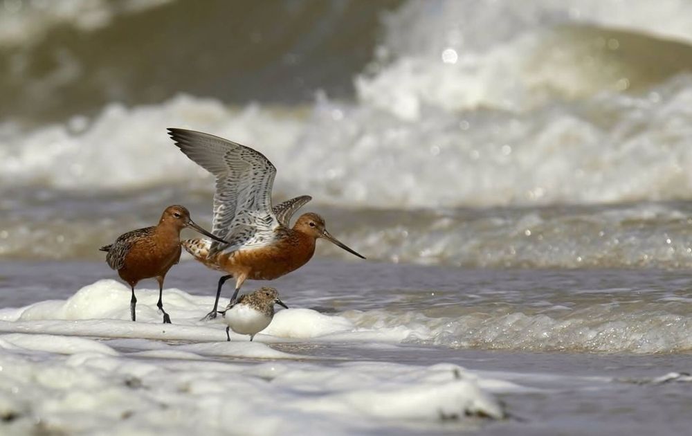 Dit jaar begin Mei aan een klein strandje Oostkant Texel. Rosse Grutto's en een drieteenstrandloper trotseren stevige oosterwind en plaatsen gewicht op linker pootjes om niet om te waaien.
