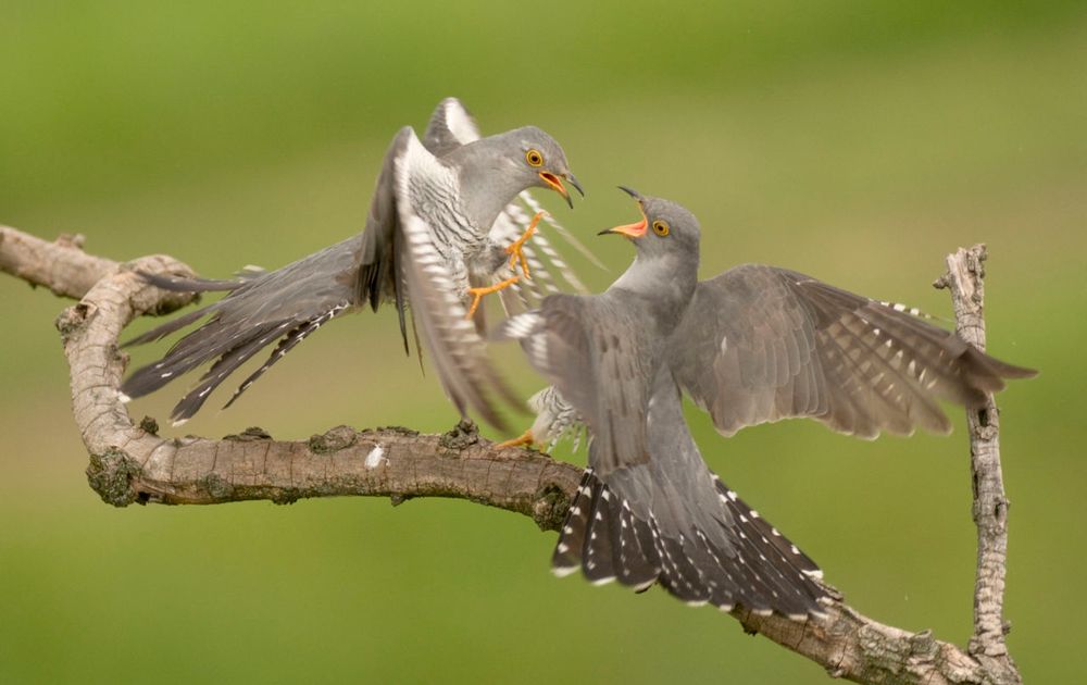 Het plaatsen van geschikte fotohutten is één, maar dan ben je er nog niet. Iedere vogelfotograaf dient te beschikken over veel geduld, doorzettingsvermogen en ook … geluk. De torenhut van Bence staat bij enkele hoge bomen met dode takken, waarin hij verschillende nestkasten heeft opgehangen. Kortom, een plek waar altijd wel iets valt te beleven. In een verloren uur eind april nam hij post in. In de verte zag hij twee koekoeken aan komen vliegen, die met elkaar aan het bakkeleien waren. Bence zijn bloed begon sneller te stromen en hij voelde dat er iets stond te gebeuren. De twee koekoekmannen leverden een fel gevecht met elkaar, maar waren binnen vijf seconden ook weer vertrokken. Voor Bence Maté lang genoeg om RAAK te schieten!