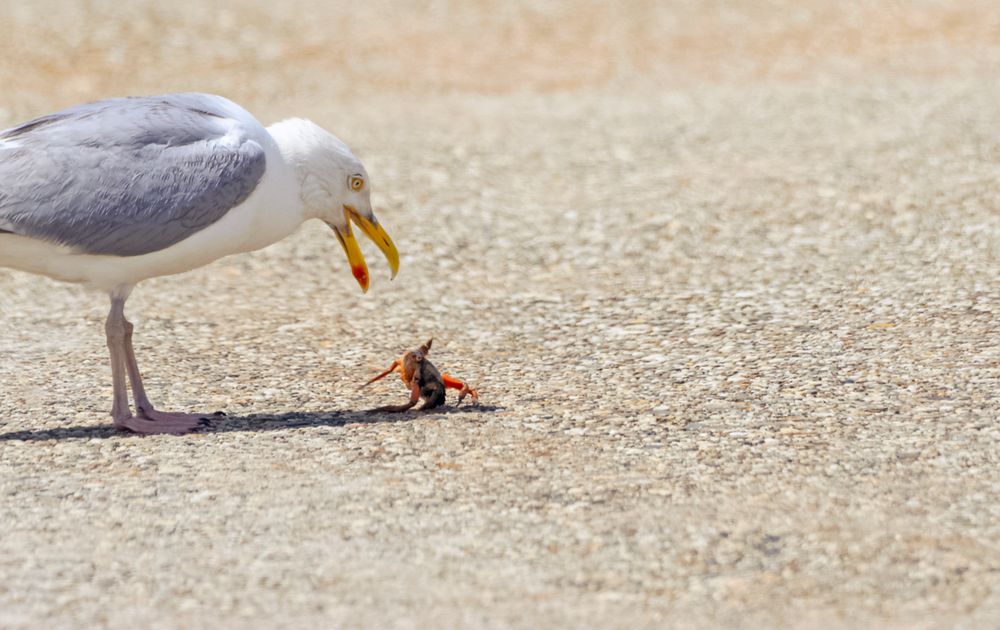Deze meeuw had de krab gevangen en liet hem hier even los. Het lijkt wel of de krab een gesprek voert met de meeuw, maar helaas heeft dit niet geholpen. De meeuw heeft de krab als nog opgegeten