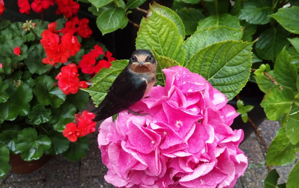 deze was te vroeg uit het nest. het nestje zit aan de voorkant voor het huis onder de dakgoot kwam terug van het wandelen met de honden hij zat op het grindpad en vloog naar de hortensia toe. Bingo de zwaluw bleef zitten dus daarom de foto