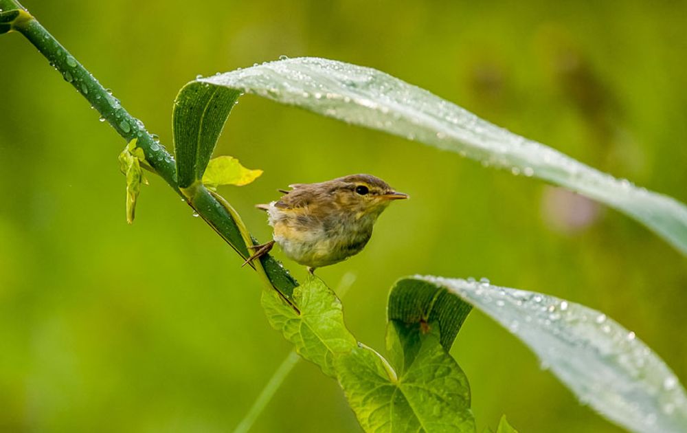 Vanuit vogelkijkhut De Poelruiter, op 3 meter afstand ging de al natte Fitis toch maar schuilen voor de regen.