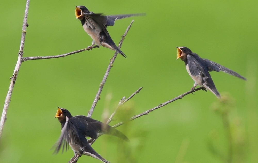 Drie jonge zwaluwen wachten op eten. Als er dan ook eten aankomt vliegen moet je natuurlijk wel aangeven dat je dit graag wilt hebben. Prachtig om te zien.