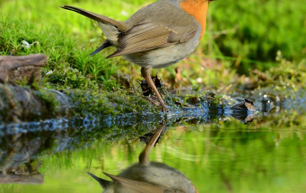 Een Roodborst weerspiegelt fantastisch in een waterpartij.