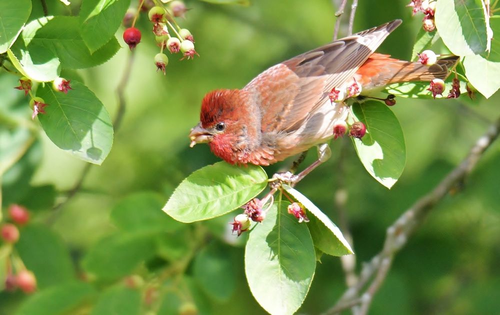 Een verrassende ontdekking dat de zeldzaam voorkomende roodmus gewoon bij mij in de tuin zat te genieten van de besjes van de krentenboom.