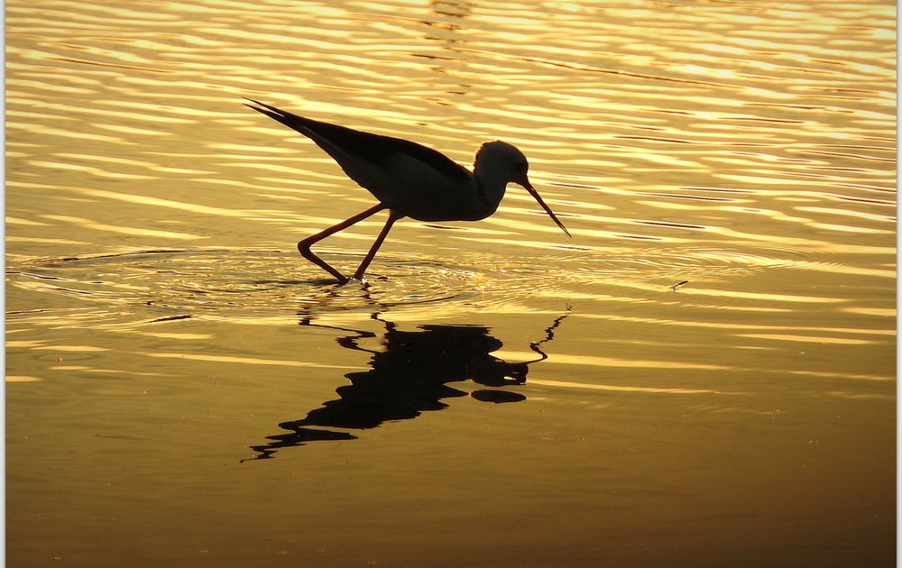 De zon weerkaatst in het water en kleurt deze met een goeden gloed de inlopende steltkluut maakte het af .