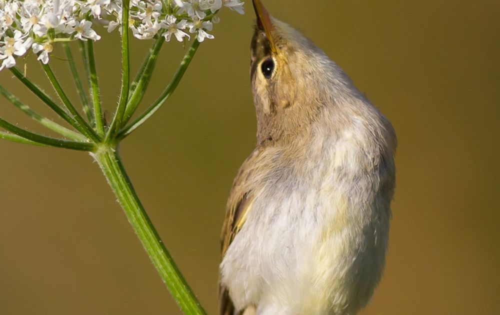 Achter het stenen muurtje dat de camping begrensde was deze Fitis bezig met voedsel zoeken en liet zich daarbij makkelijk fotograferen. Omgeving, achtergrond en voedsel werkten allemaal mooi mee.
