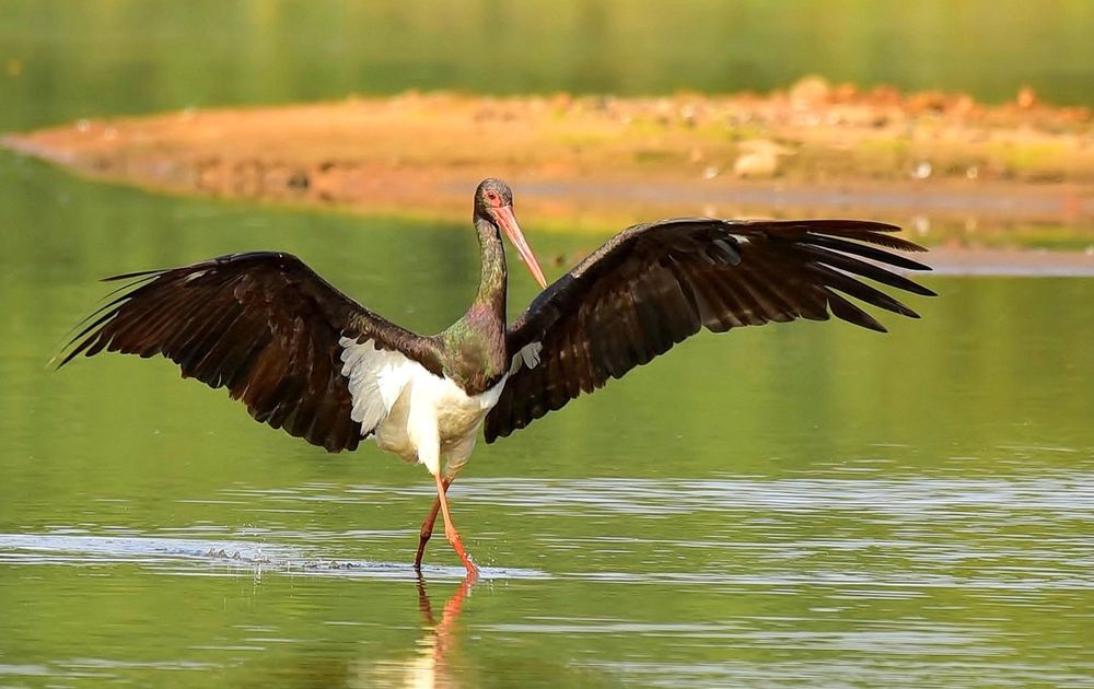 Zwarte ooievaar in een bijna drooggevallen en afgelegen plas op zoek naar voedsel.