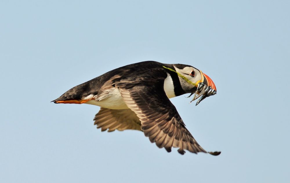 Een Papegaaiduiker brengt voedsel mee voor haar jongen. Leuk detail, er zit ook nog een stukje wier tussen de visjes !
