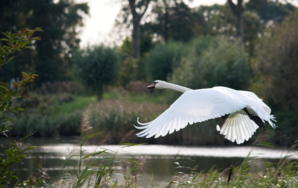 Ik liep te wandelen met mijn fototoestel. Toen ik keek waar het geluid vandaan kwam vloog deze zwaan langs mij. Snel een foto gemaakt