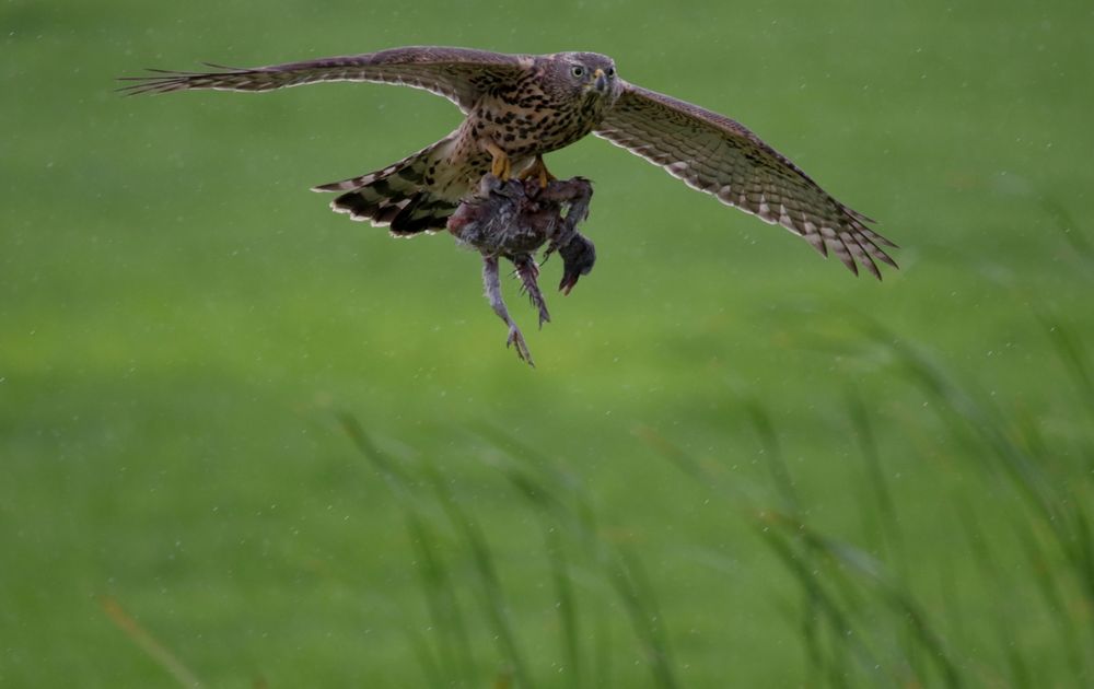 Op ca. 200 m afstand zie ik een roofvogel vanuit de huiskamer in het weiland neerstrijken. Hij zit met vleugels wijd op het gras. Ik dacht dat is interessant en besloot mijn camera te pakken en naar buiten te gaan. Ik stond onder de dakgoot omdat het licht regende. Een van de koeien liep op de roofvogel af. De vogel vloog op en kwam recht op me af ! Op ca. 25 m afstand boog de vogel licht af en ging door onze zijtuin. Een jonge Havik met prooi. Het beest vloog laag over het weiland en ging net over het riet bij de sloot. Wat een mooie natuurbeleving.