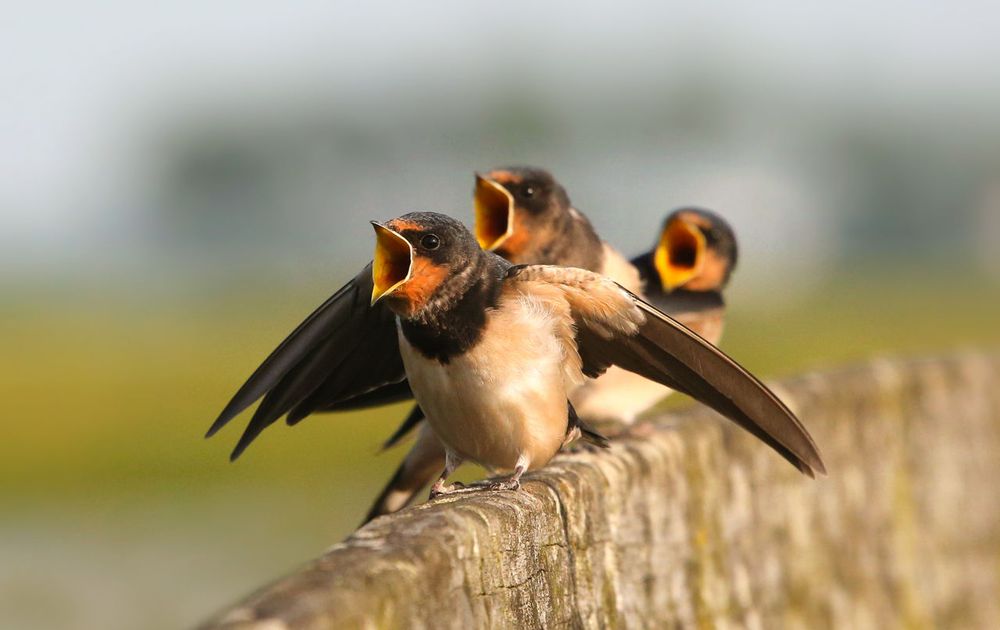 Deze pas uitgevlogen Boerenzwaluwen werden nog door hun ouders gevoerd, telkens al een ouderdier naderde gingen de snavels wijd open in afwachting van al dat lekkers.