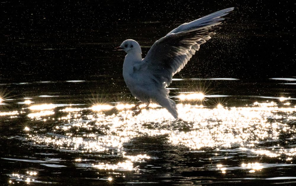 Deze kokmeeuw was zich actief aan het wassen en dook meermaals het water in. Door dit met een mooie lichtval te fotograferen is er een magische sfeer ontstaan.