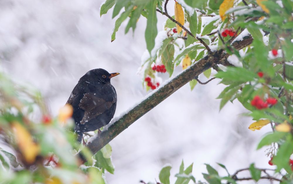 Eindelijk sneeuw. Door de hevige sneeuwval viel het nog nietje om een foto te maken. Elke keer zaten er vlekken voor de vogel van de sneeuw