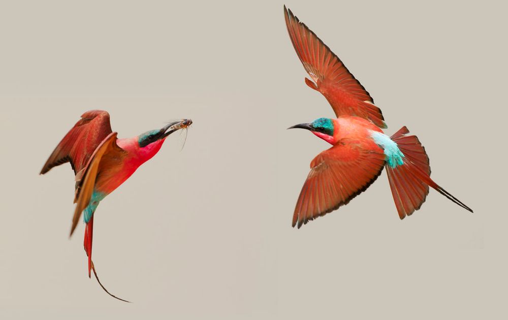 Deze twee karmozijnrode bijeneters fotografeerde Adri in Zambia aan de oevers van de Luangwa-rivier. “Een week lang parkeerde ik mijn terreinwagen met open dak op de twintig meter hoge oever, waar zo’n honderd bijeneters hun broedkolonie hadden. De vogels vlogen me letterlijk om de oren en soms zag het rood voor mijn ogen. In totaal heb ik er zo’n tweeduizend foto’s geschoten, maar soms stond er maar een halve vleugel of zelfs helemaal niets op. Uiteindelijk hield ik tien echt goede foto’s over.”