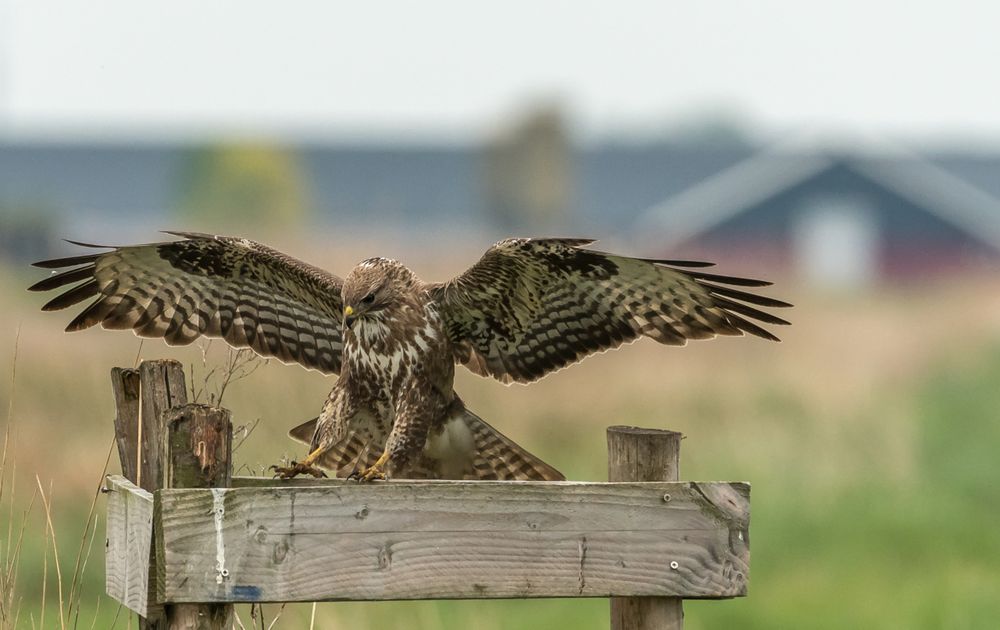 De buizerd zak op het hek. Toen ik een foto wilde nemen, vloog hij/zij op. Na één rondje landde hij/zij pal voor mijn neus op dezelfde plek!