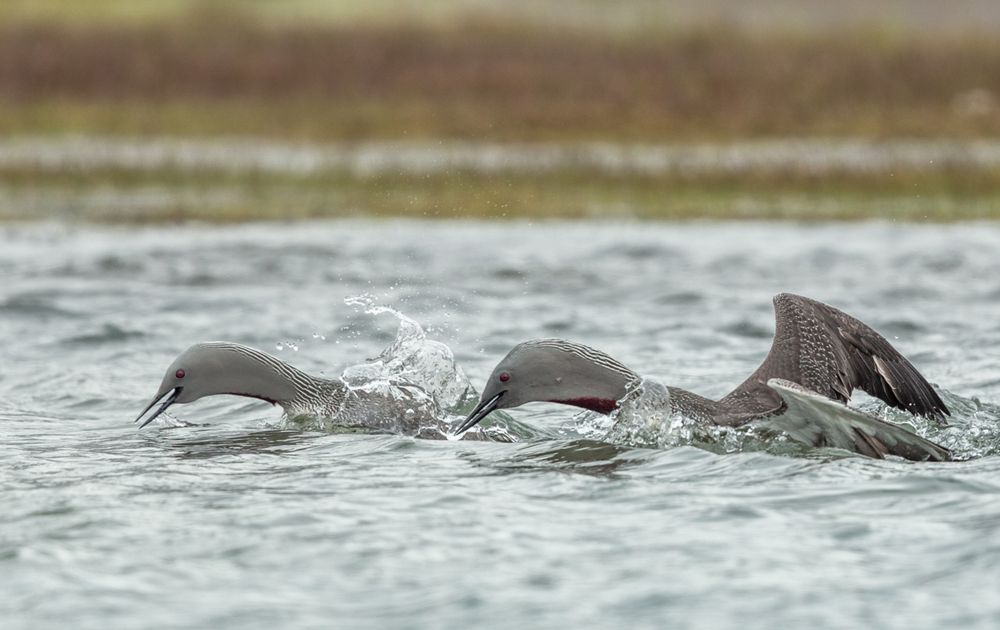 Voor mij een uniek moment om te kunnen genieten van deze Balts van de Roodkeel-duikers,het gaat gepaard met veel gespetter en geluid, een soort gehuil. Dit is maar éen onderdel, andere momenten gaan ze duikenen schudden met hun koppen, wat een belevenis.