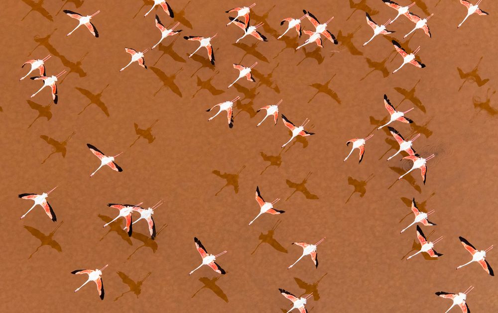 Je moet twee keer kijken en dan nog snap je niet wat je hier ziet. Een sfeervol behangmotief of een leuk ontwerp voor een vogeljurkje? Niets van dat al. Een groep flamingo’s vliegt boven de zoutpannen van San Fernando in Cádiz (Spanje). De felle zon projecteert de schaduwen van de vogels op het dunne laagje water dat in de pannen staat. Dit verklaart de kronkelige nekken in de schaduwbeelden.