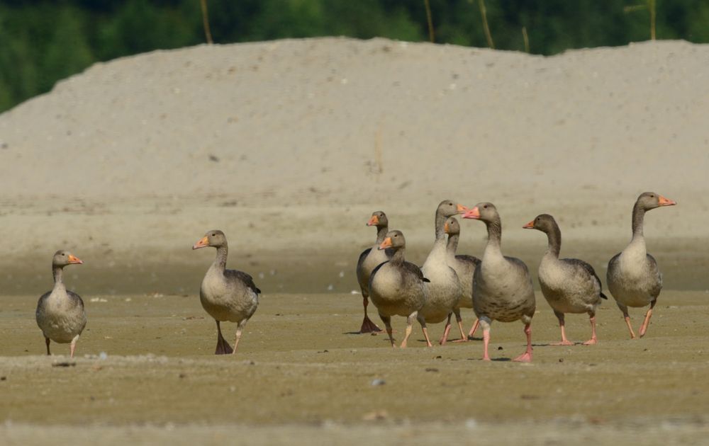 Een aantal Grauwe ganzen aan de wandel.