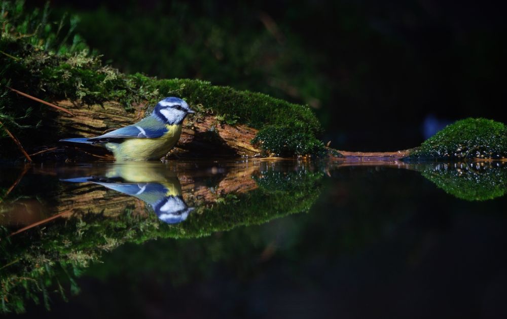 Foto genomen vanuit een vogelhut. Deze pimpelmees ging net in een streepje licht zitten