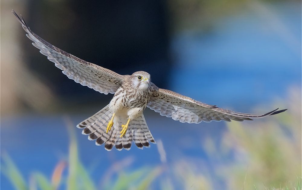 De Torenvalk vlieg op bij een brede sloot, het water, het gras/riet en de brug (nauwelijks als brug te herkennen op de plaat) op de achtergrond geven de mooie kleuren. De Torenvalk komt zo mooi uit