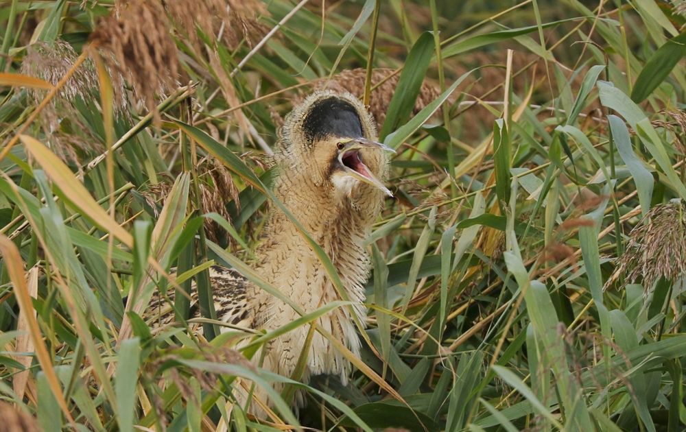 De roerdomp was niet erg blij toen er plotseling een blauwe reiger onder hem door vloog en 2 meter verder in het lage water ging staan.Hij begon meteen te blazen,en zette zijn kraag op!
