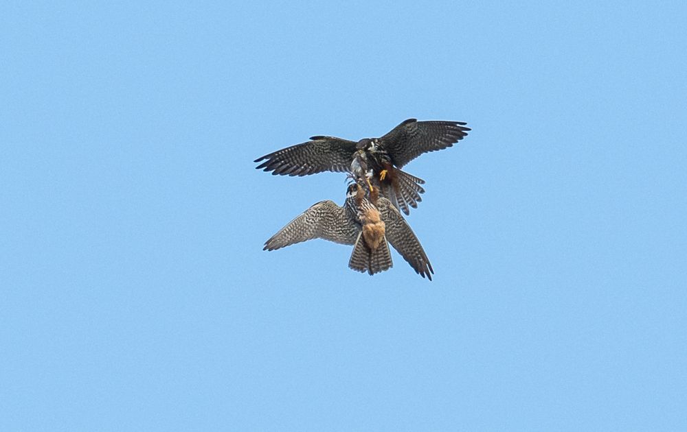 Een tijdje terug toen het koppel Boomvalken nog jongen had heb ik meerdere keren de prooi overdrachten kunnen vast leggen. Vaak ver weg maar spectaculair om te zien. De ouder die de prooi bracht gaf het via de bek aan de ontvanger die het (zover ik heb meegemaakt) altijd met de poten aanpakte.