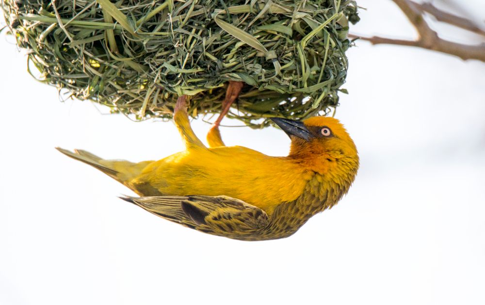 Een yellow weaver hangt aan zijn nestje. Het vrouwtje keurt uiteindelijk het nestje of het geschikt is. Het wordt vaak tot zes keer toe afgekeurd. Het mannetje kan dan weer opnieuw beginnen. Foto genomen in oktober in Zuid-Afrika (daar dus lente!)