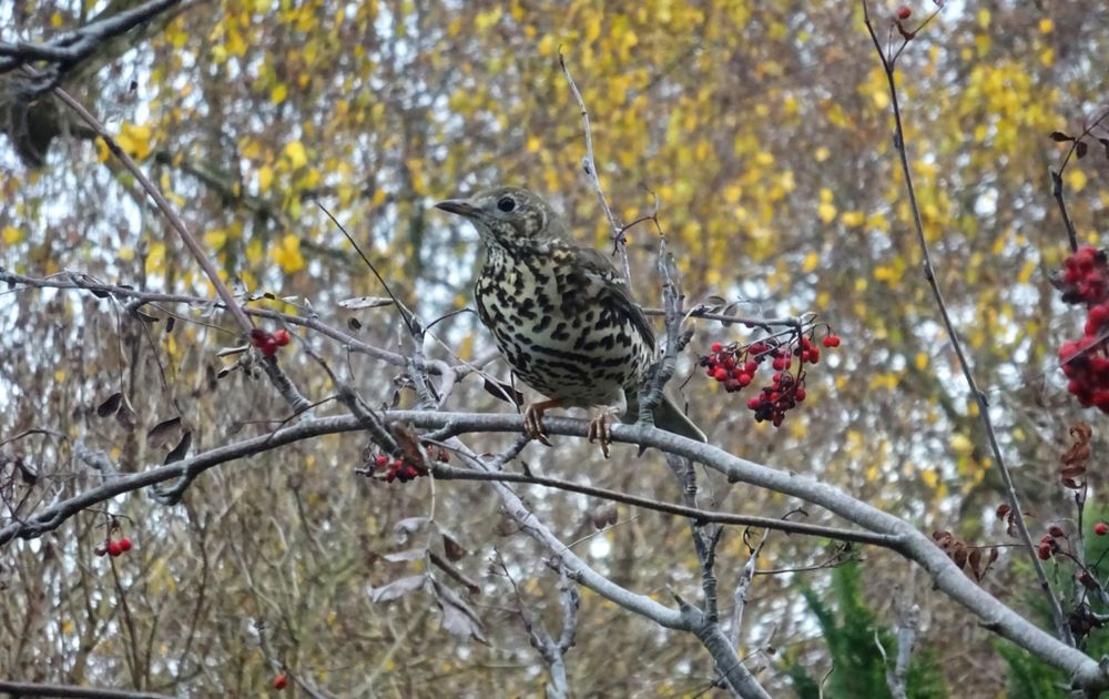 Deze grote lijster had wel zin in de laatste bessen uit de lijsterbes in onze tuin. Ik kon de foto maken vanuit de huiskamer op zo'n 2 meter afstand.