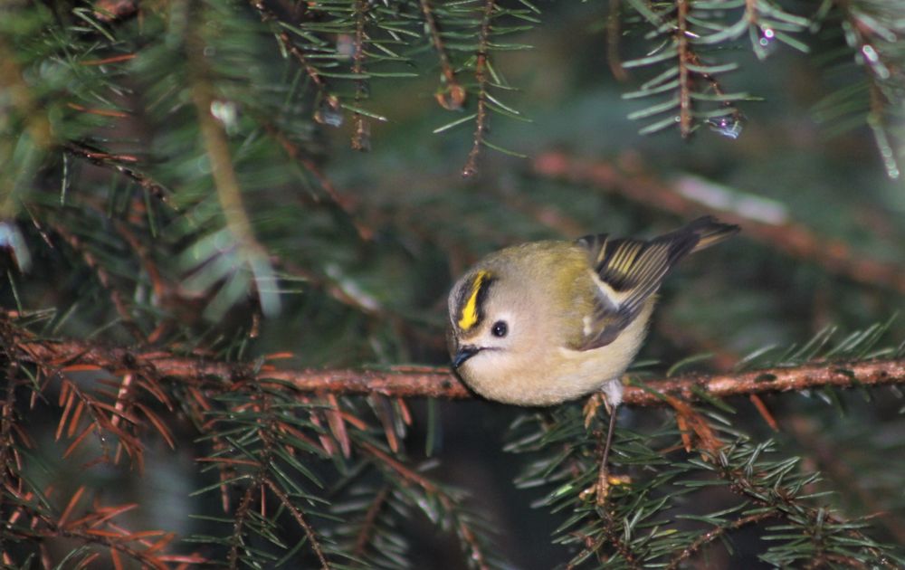 Tussen al dat dennengroen lijkt dit Goudhaantje wel een kerstbal. Maar dan wel een van een uiterst onrustige soort.
