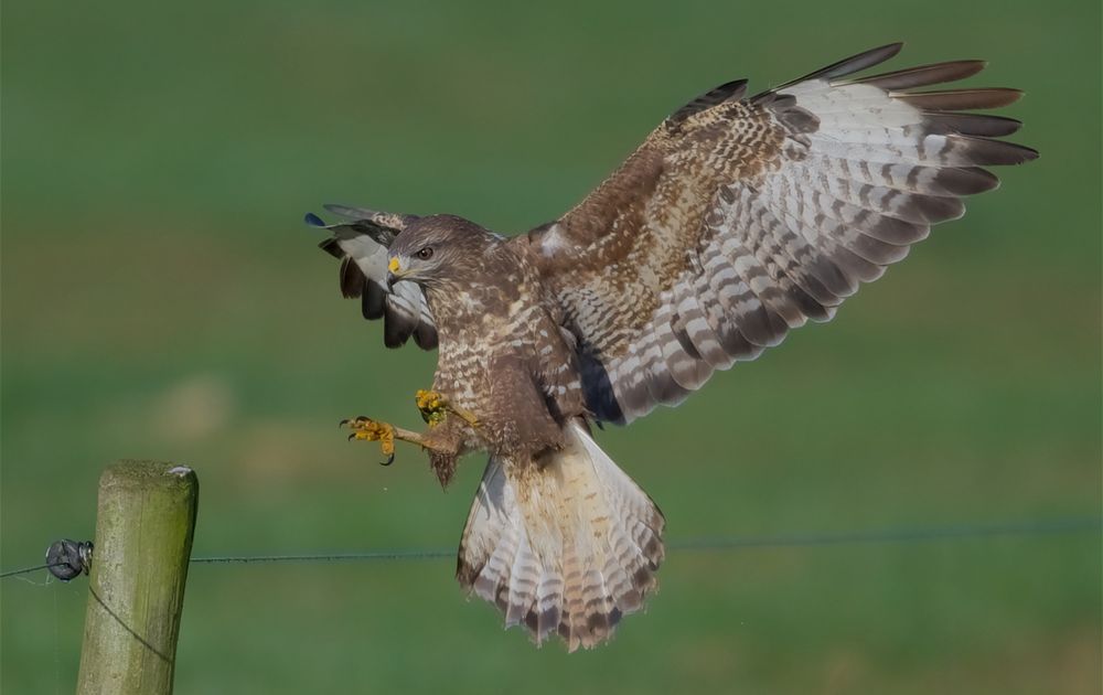 Hier de landing van een Buizerd op een paaltje. Mooi gezicht met die gespreide vleugels
