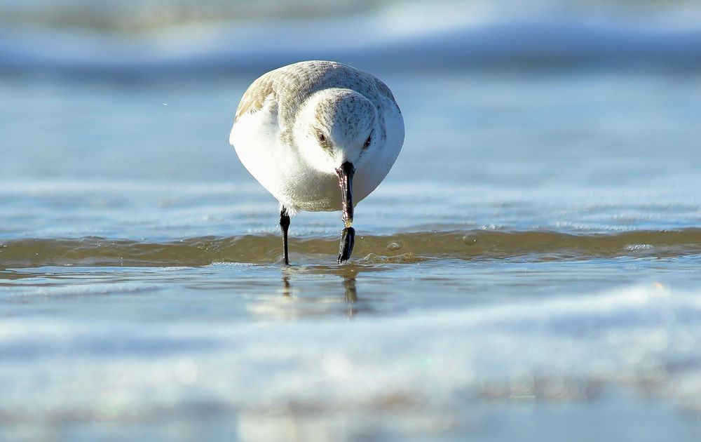 op het strand liggen om vogel op ooghoogte te fotograferen. Vogel scoort net een hapje!
