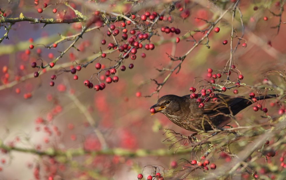 Een dag voordat de heftige sneeuwval begint is deze merel nog druk bezig met genieten van de meidoornstruiken.
