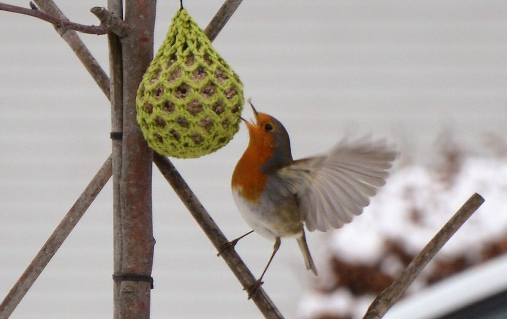 Af en toe brengt een Roodborstje ons een bezoek. Ze zoeken vaak voer op de grond, maar deze vond de vetbol ook wel lekker. Niet gek, er was net een behoorlijk pak sneeuw gevallen.