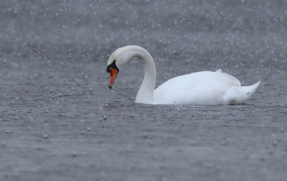 Schuilend voor een hagelbui [in een vogelkijkhut] deze knobbelzwaan kunnen fotograferen.