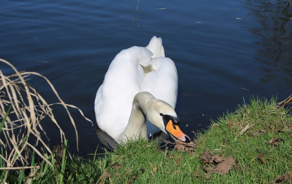 Enkele dorre bladeren, die op de kant lagen, hadden de volle aandacht van deze knobbelzwaan.
