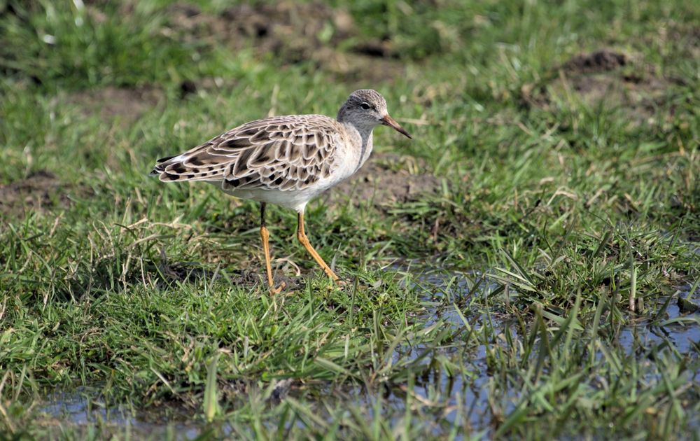 Kijkend over de polderlandschappen zag ik deze kemphaan op een nat grasland lopen.