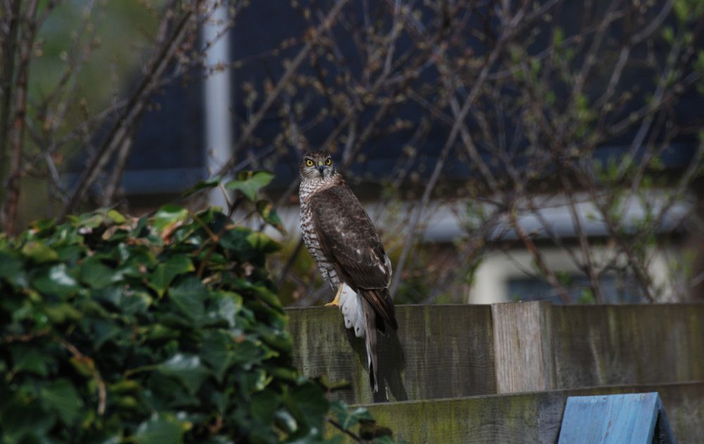 Deze sperwer is de laatste 2 maanden een regelmatige bezoeker in onze achtertuin en ook de plek waar ie z'n prooi verorberd...
