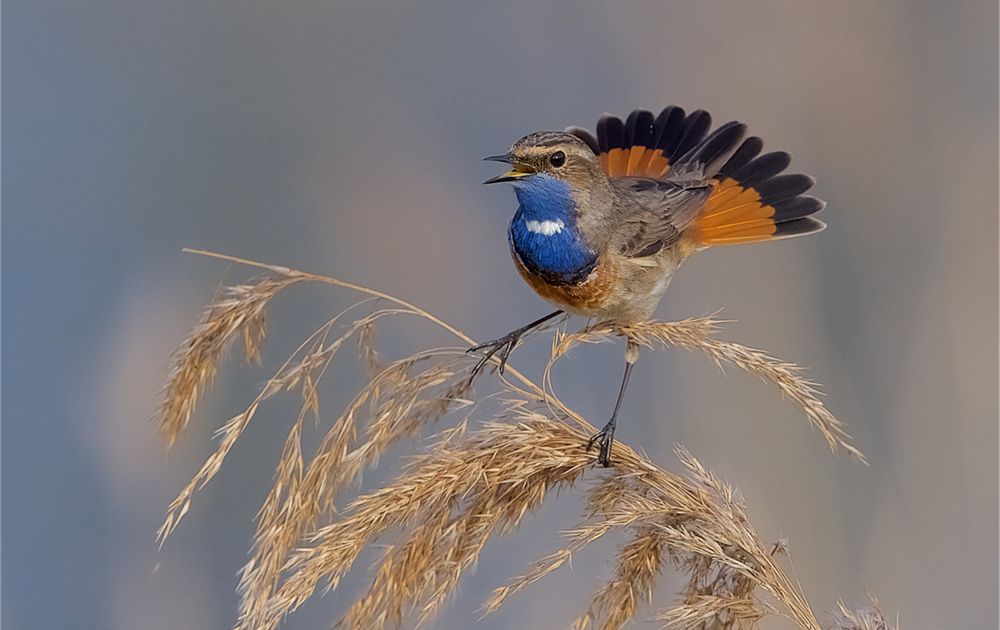 Vanmorgen tijdens een wandeling op de dijk deze fraaie plaat kunnen maken van een Blauwborst. Druk aan het zingen en met een fraai geopende staart.