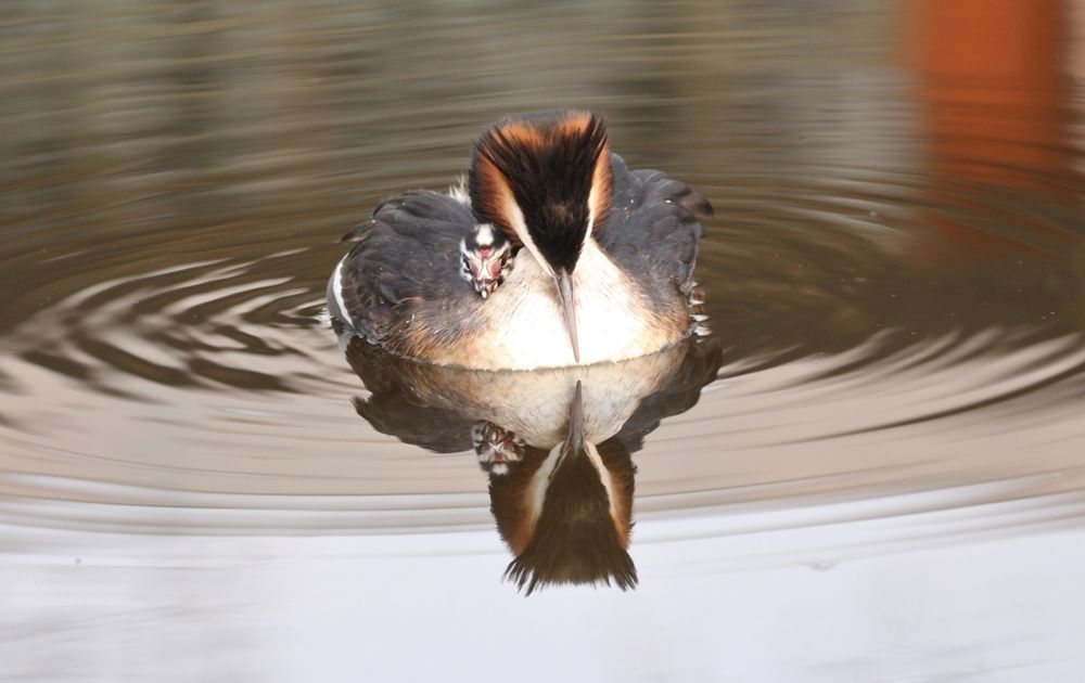 Ik reed met de auto langs die sloot.Toen viel me oog op die fuut. Ik dacht zie ik het nou goed heb hij een jong op zijn rug? En ja hoor .Ik snel naar huis. Me camera gepakt en er weer naar toe gegaan. En ze keek recht het water in. Haar jong ook. Ik hoort de die kleine zeggen kijk mam ik zie me zelf.