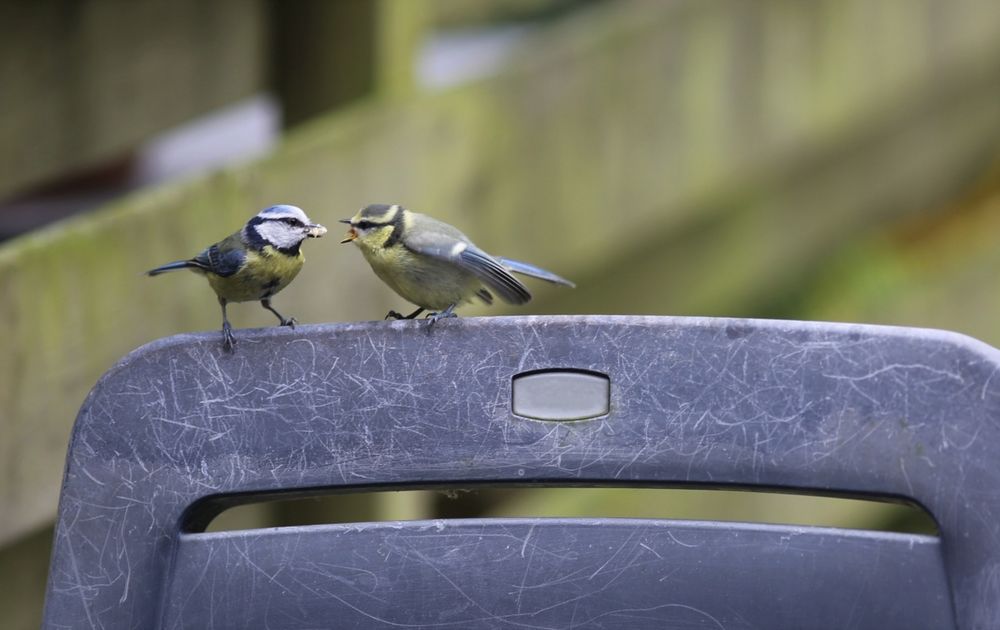 Pimpelmeesjes vliegen nu af en aan naar het voederpotje (van de Vogelbescherming). De "grote" pimpelmees heeft het er maar druk mee. Maar zo te zien komt het helemaal goed met dit kleine pimpelmeesje. Hij groeit als kool.