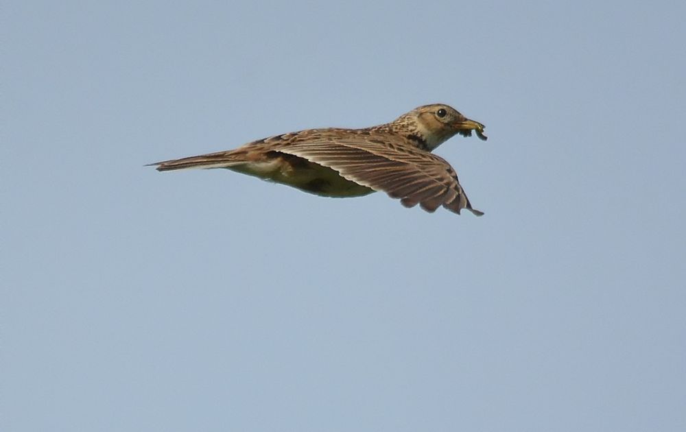 De veldleeuwerik laat zich op zeer hoge hoogtes horen, deze vloog langs en had een rupsje in zijn snavel, mooi moment!