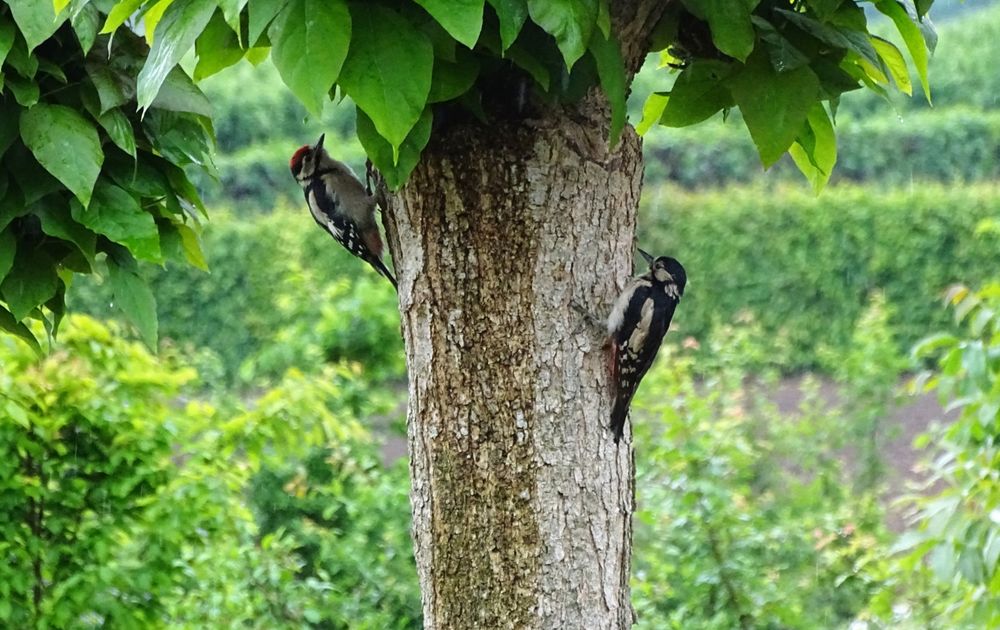 Jonge specht (met het rode petje) verkent, samen met mama, de omgeving.