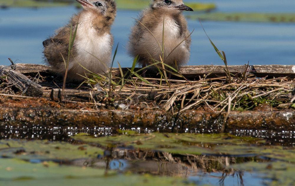 Op de vlotjes in de wieden verschillende nesten met zwarte sterns. Vanuit de boot, met verrekijker én met een telelens kun je ze goed volgen. Rustig wachten....tot de eigen ouders in de buurt komen....dan zijn ze één en al in actie.