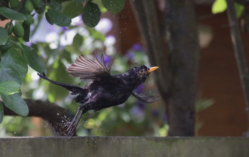 De merel heeft het warm. En heeft net een waterbad genomen. Dat helpt.