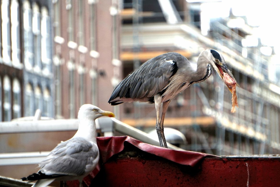 Reiger verorbert stuk vis onder toeziend oog van meeuw