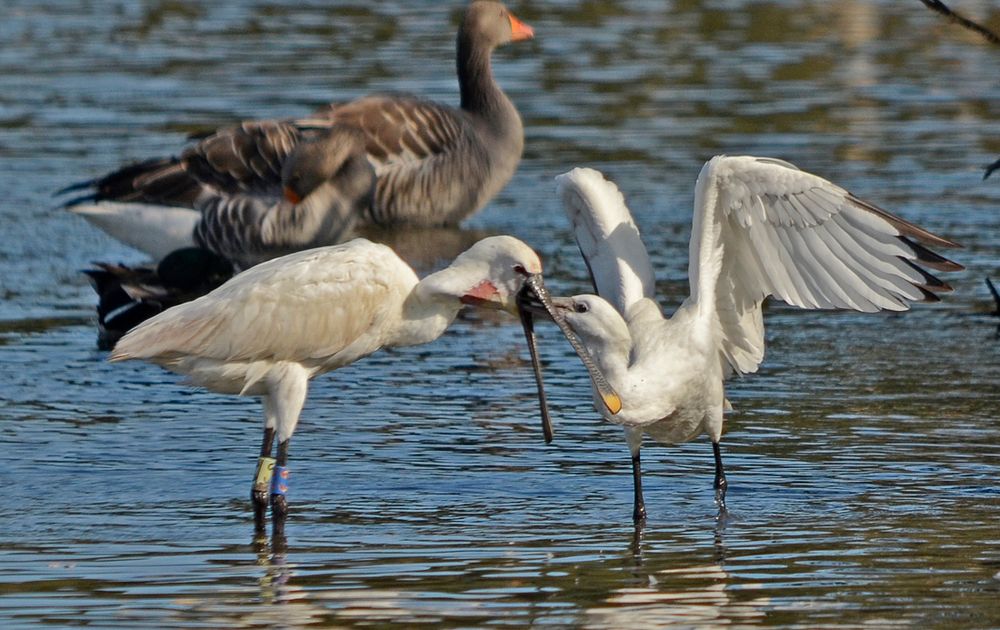 Jonge lepelaar krijgt voer van zijn ouder, de lepel verdwijnt tot diep in de keelzak en is duidelijk te zien, moet toch wel een benauwd gevoel geven voor de oudervogel, zo'n grote snavel in de keel te hebben.
