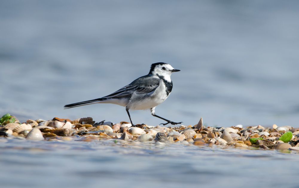 Deze kwikstaart liep parmantig over een heel smal strookje schelpenstrand