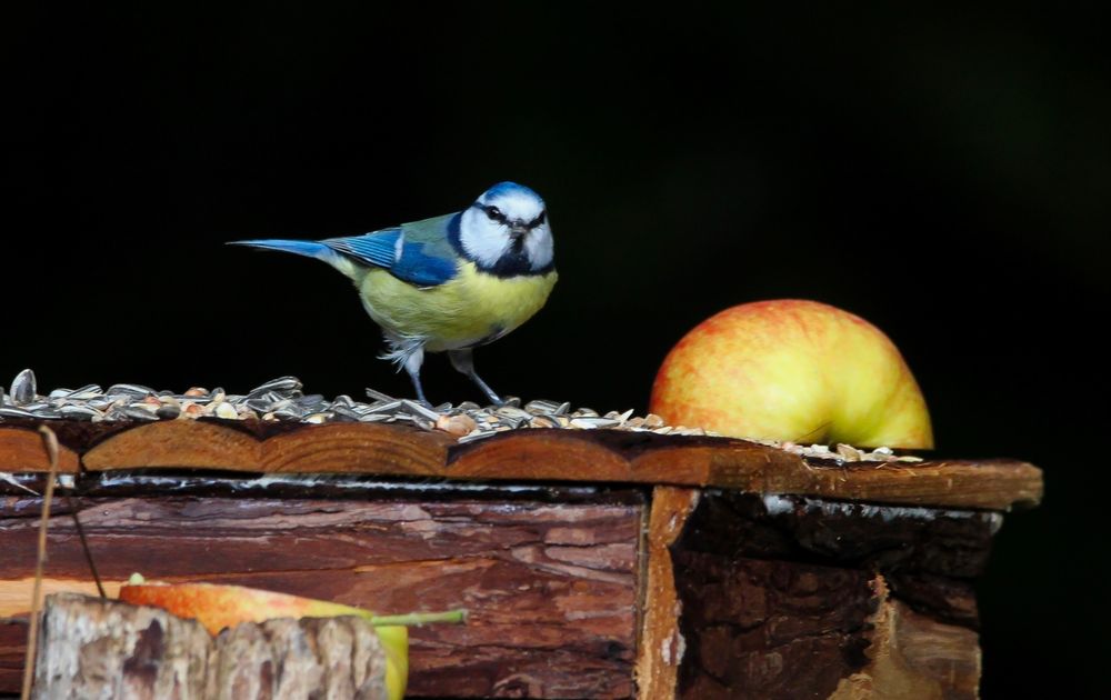 Foto zo genomen dat op het juiste moment het zonlicht op de Pimpelmees scheen en de avhtergrond van het bos donker bleef