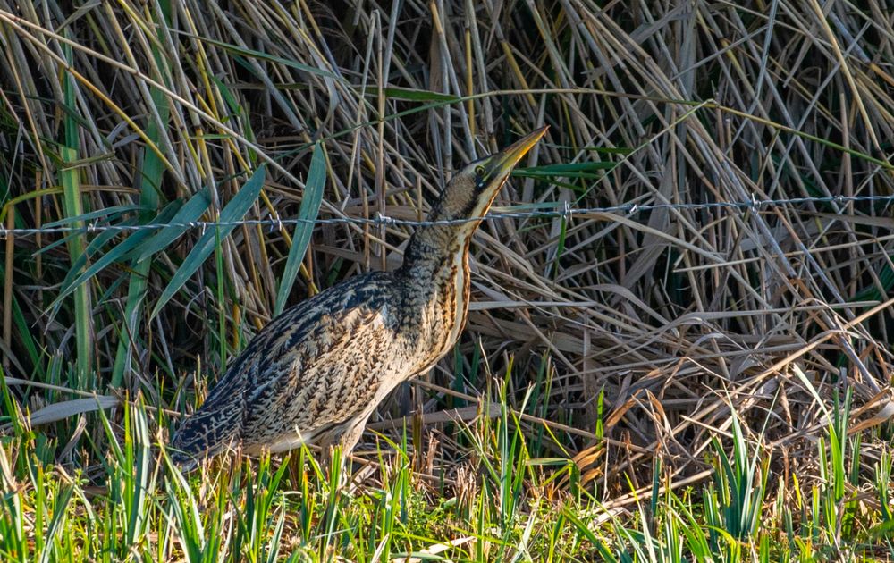 Je ziet ze niet zo vaak of je merkt ze niet op. De roerdomp sluipt langs het riet met een blik: "Ik zit achter het prikkeldraad fotograaf en ben beschermd" Wat een prachtig gezicht hoe deze vogel zo mooi stil kan staan. Een toevalstreffer dat ik deze roerdomp zag staan.