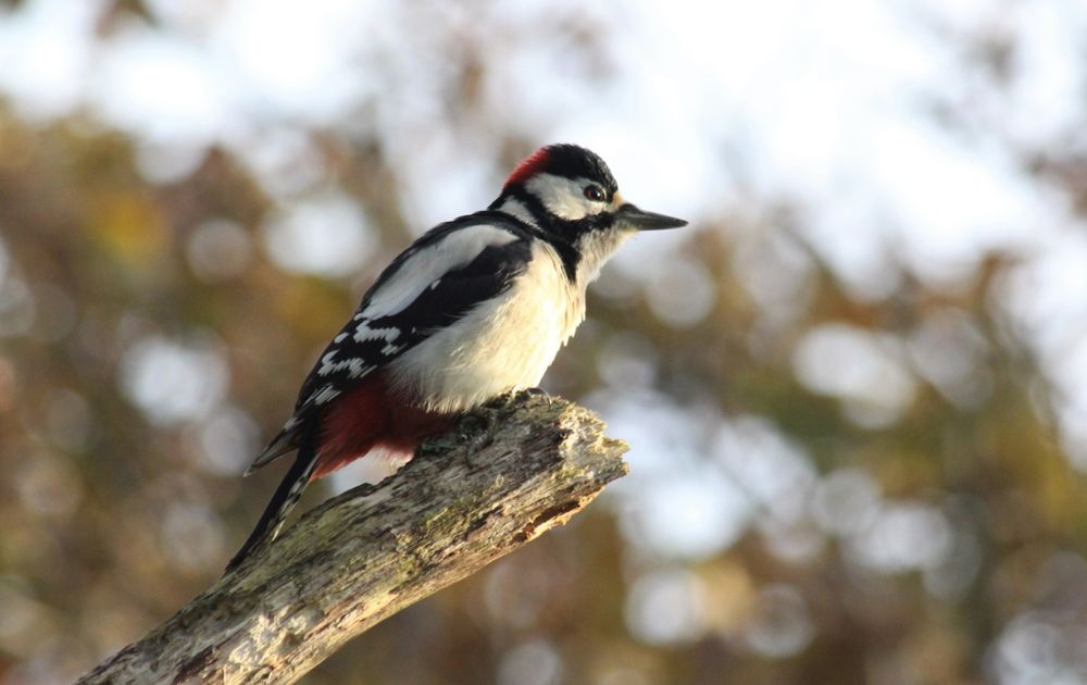 Een Grote bonte specht warmt zichzelf op in de ochtendzon te midden van de Amsterdamse waterleidingduinen